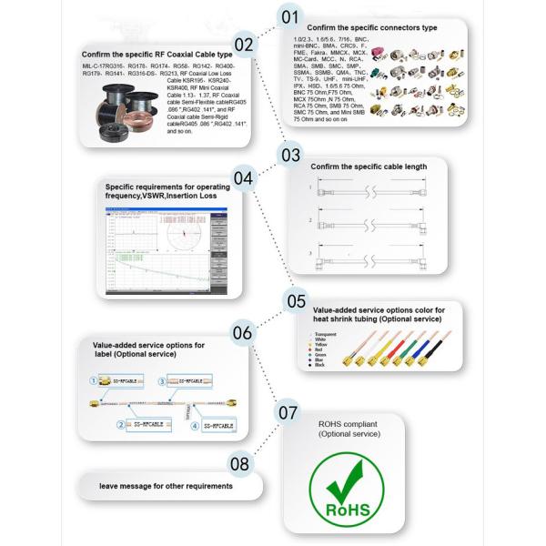 4. RF cable assembly routine connectors:IPEX, MMCX,MCX,SMB,SMA,FME,CRC9, F,N,TNC,BNC,etc.